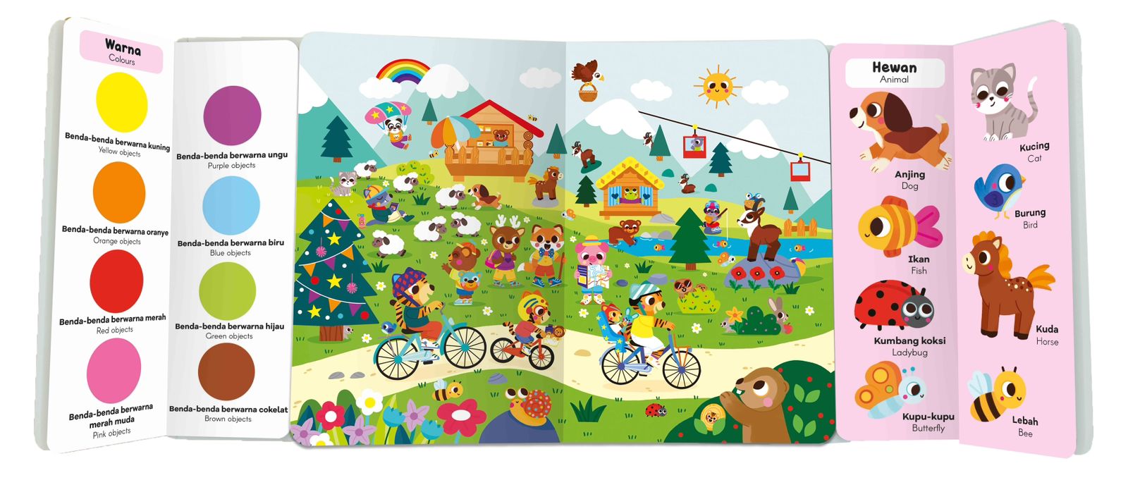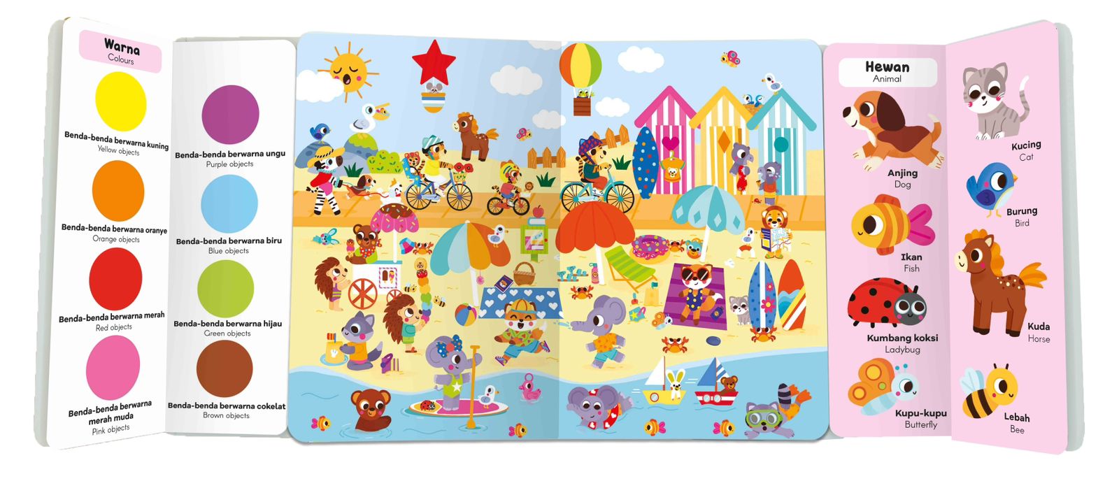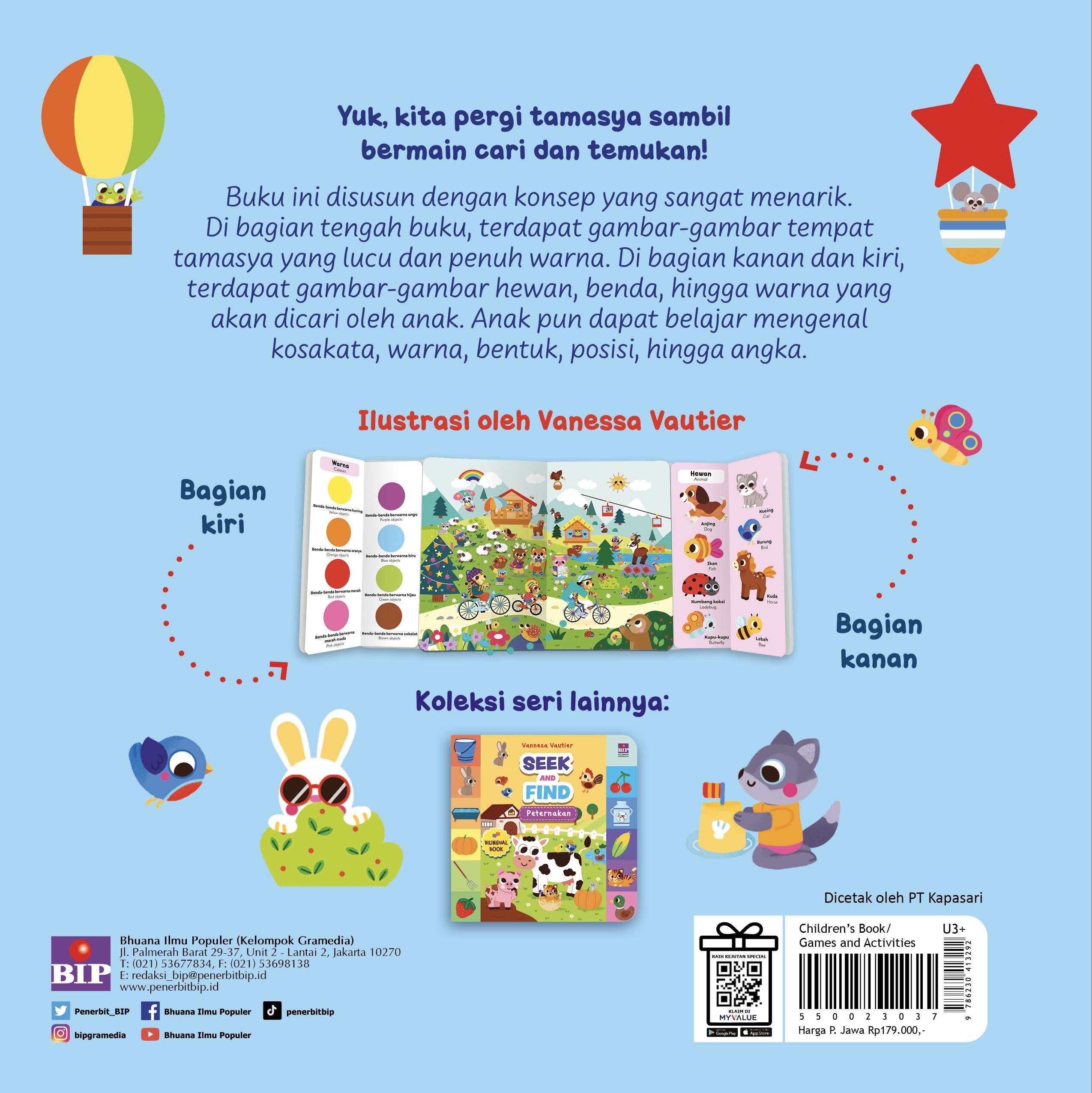 Buku ini disusun dengan konsep yang sangat menarik. Di bagian tengah buku, terdapat gambar-gambar tempat tamasya yang lucu dan penuh warna. Di bagian kanan dan kiri, terdapat gambar-gambar hewan, benda, hingga warna yang akan dicari oleh anak. Anak pun dapat belajar mengenal kosakata, warna, bentuk, posisi, hingga angka.