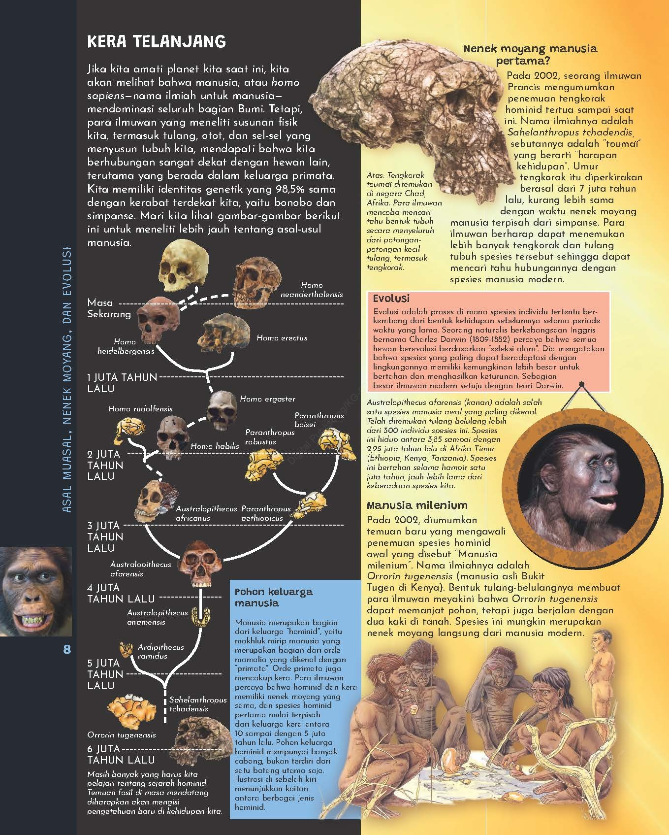 Pada 2002, seorang ilmuwan Prancis mengumumkan penemuan tengkorak hominid tertua sampai saat ini. Nama ilmiahnya adalah Sahelanthropus tchadendis, sebutannya adalah “toumaï” yang berarti “harapan kehidupan”. Umur tengkorak itu diperkirakan berasal dari 7 juta tahun lalu, kurang lebih sama dengan waktu nenek moyang manusia terpisah dari simpanse. Para ilmuwan berharap dapat menemukan lebih banyak tengkorak dan tulang tubuh spesies tersebut sehingga dapat mencari tahu hubungannya dengan spesies manusia modern.