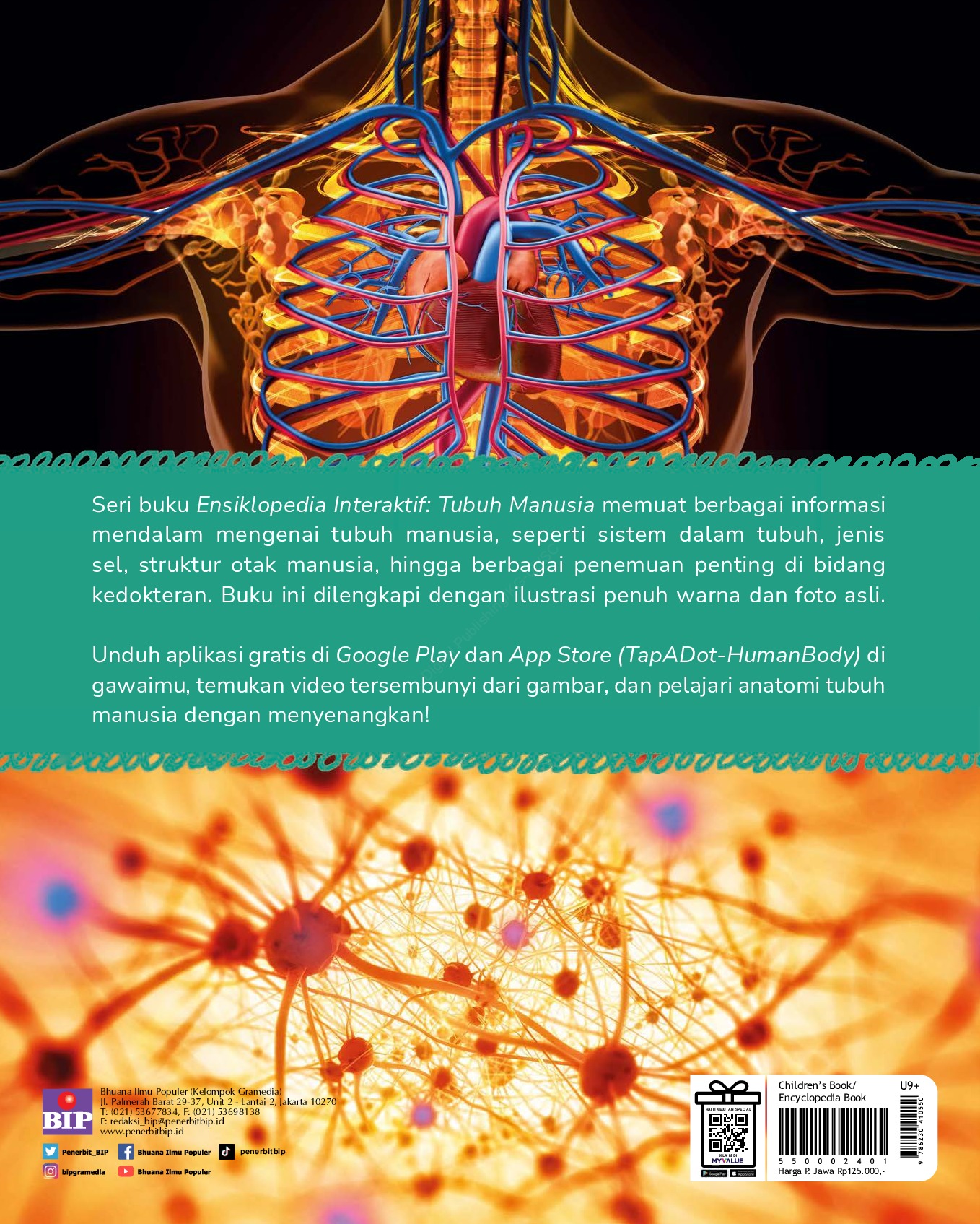 Seri buku Ensiklopedia Interaktif: Tubuh Manusia memuat berbagai informasi mendalam mengenai tubuh manusia, seperti sistem dalam tubuh, jenis sel, struktur otak manusia, hingga berbagai penemuan penting di bidang kedokteran. Buku ini dilengkapi dengan ilustrasi penuh warna dan foto asli. Unduh aplikasi gratis di Google Play dan App Store (TapADot-HumanBody) di gawaimu, temukan video tersembunyi dari gambar, dan pelajari anatomi tubuh manusia dengan menyenangkan!