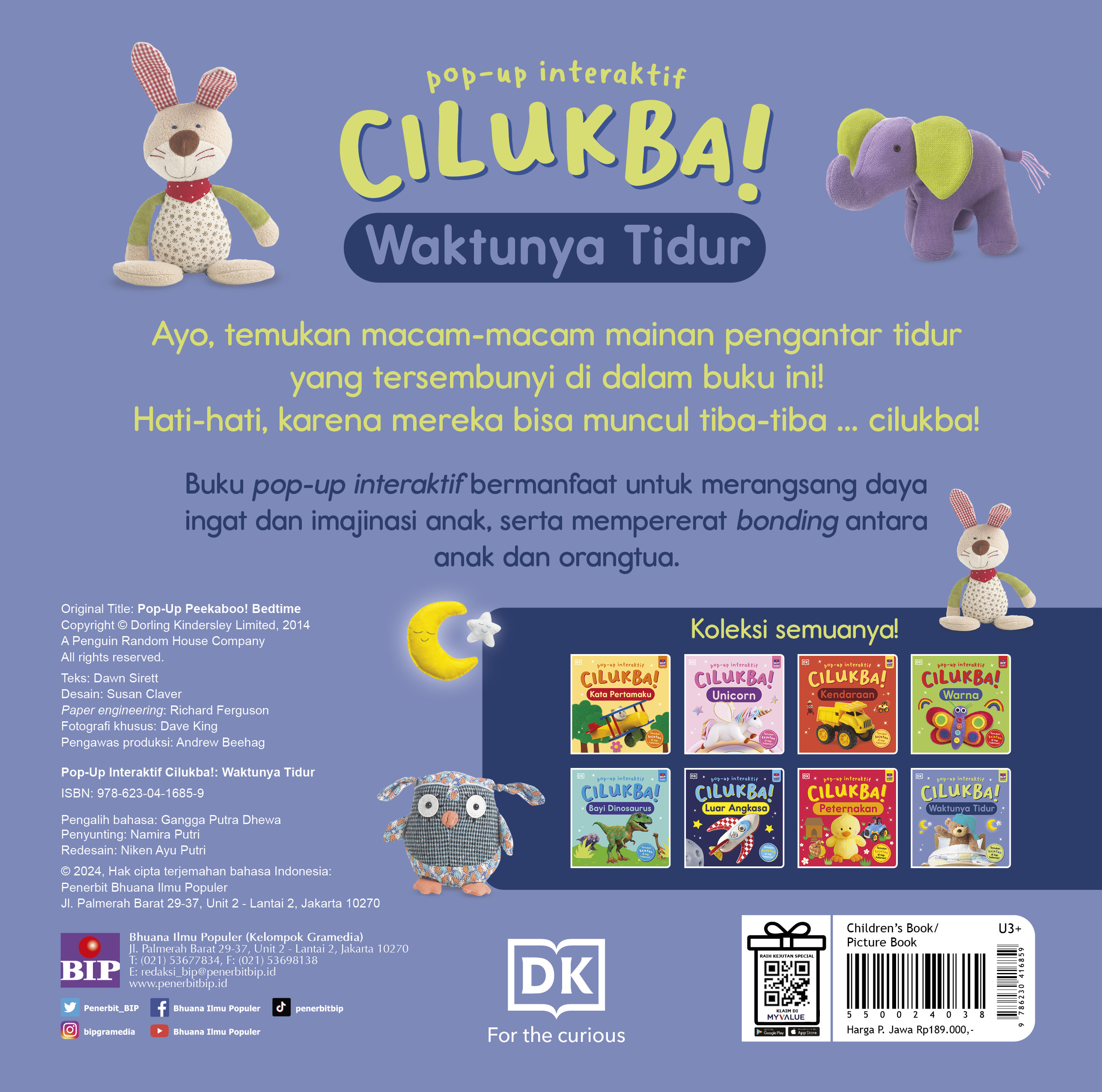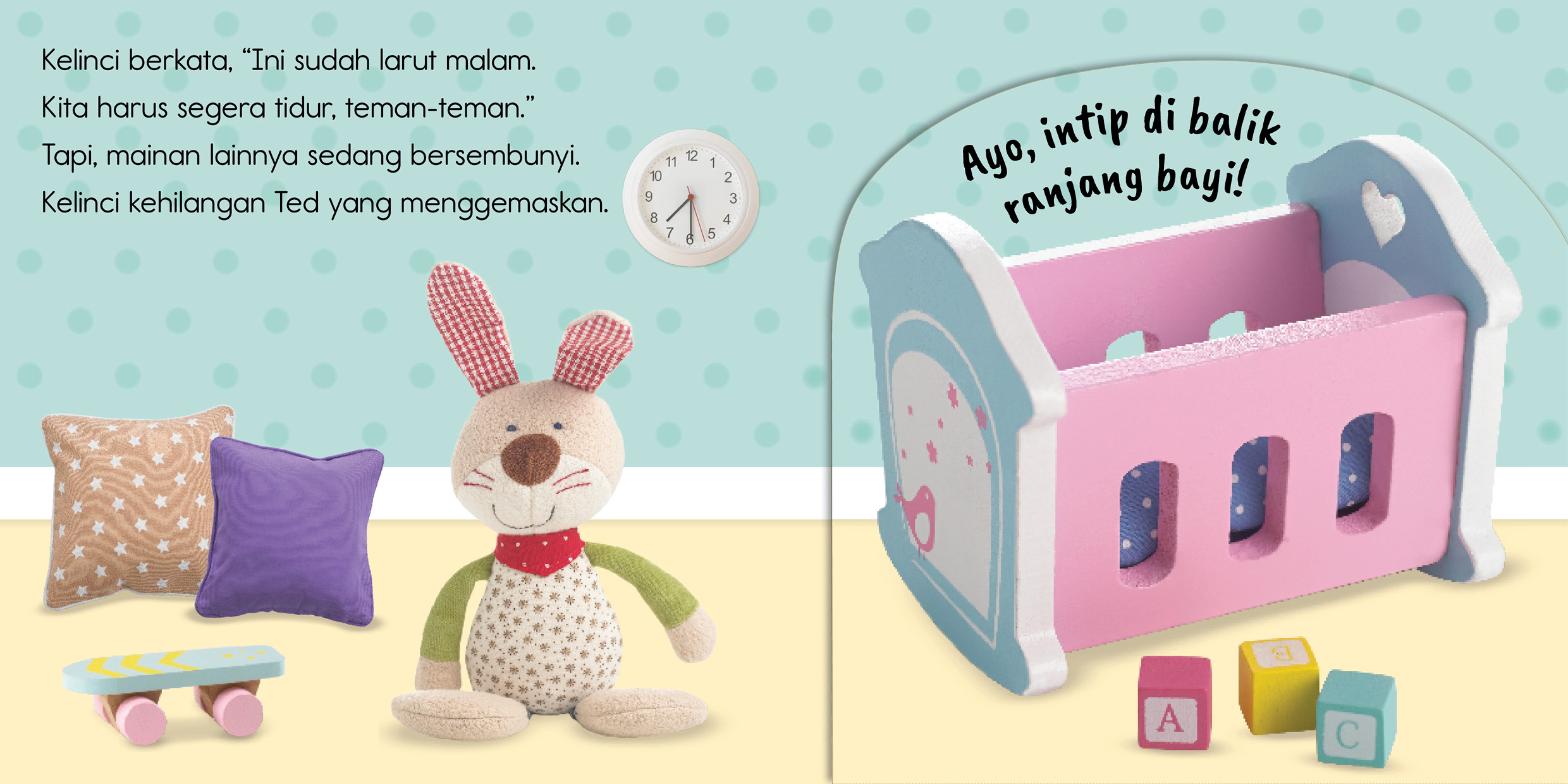Ayo, temukan macam-macam mainan pengantar tidur yang tersembunyi di dalam buku ini! Hati-hati, karena mereka bisa muncul tiba-tiba ... cilukba!