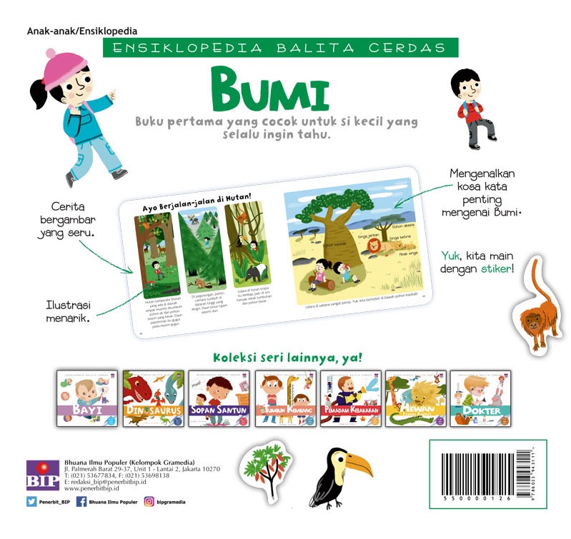 Ensiklopedia Balita Cerdas: Bumi berisi pengetahuan seputar Bumi. Misalnya, tentang kejadian pagi dan malam di Bumi, indahnya pegunungan, hingga bencana yang diakibatkan oleh manusia dan bagaimana cara mencegahnya. Buku ini dilengkapi dengan aktivitas-aktivitas mengasyikkan di akhir cerita. Serta, dilengkapi dengan bonus stiker yang menarik nan lucu.