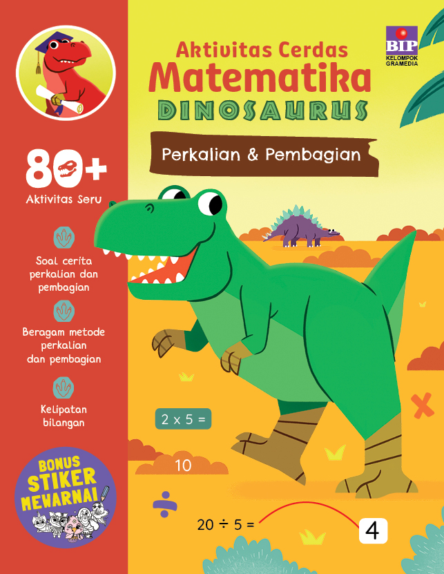 Soal matematika di buku ini disusun berjenjang. Kamu pasti jadi mudah memahami perkalian dan pembagian dengan cepat! Ayo, belajar dan bertualang bersama dinosaurus!