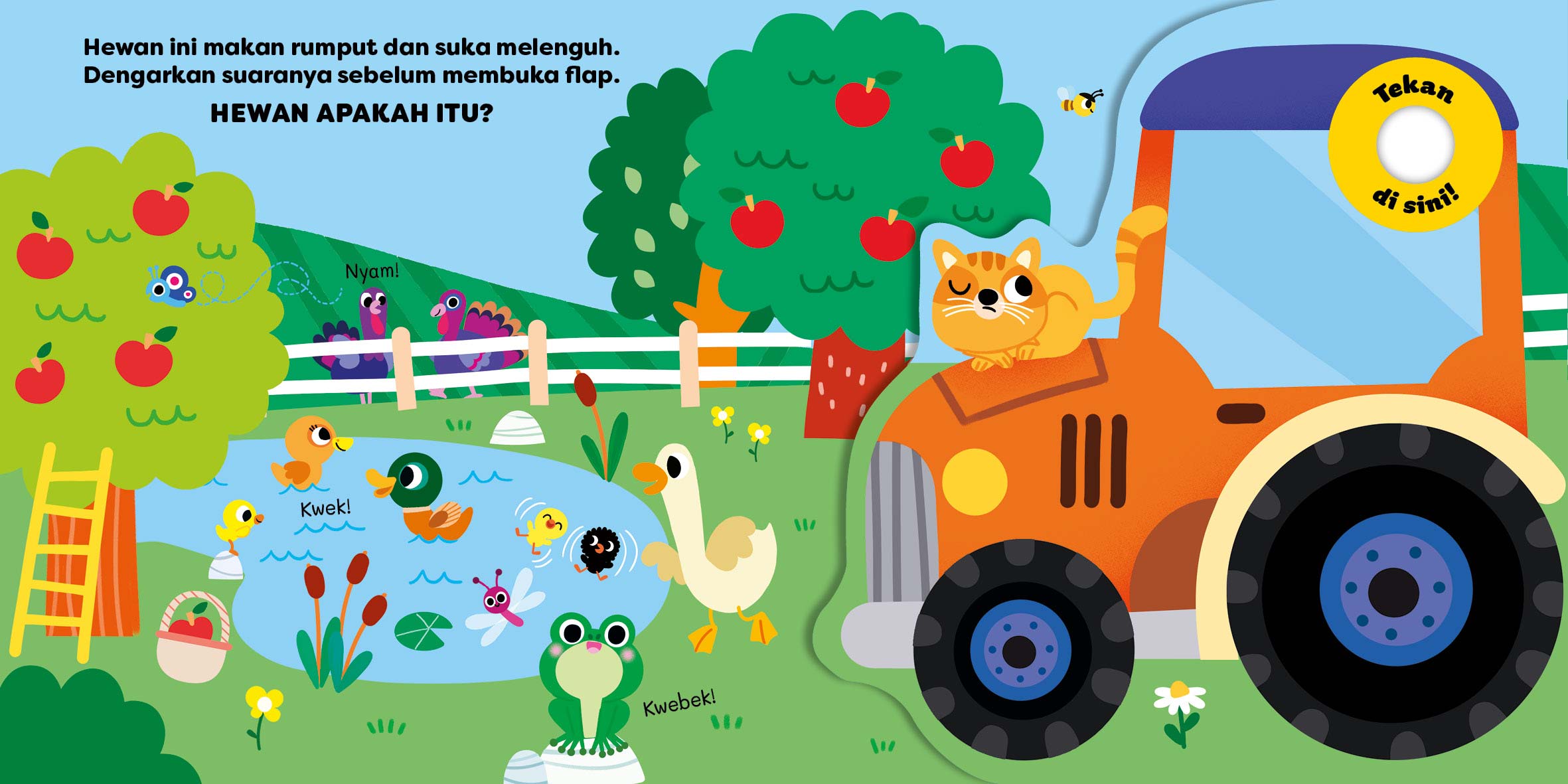 Tekan tombolnya, dengarkan suaranya, lalu tebak hewan apa yang ada di peternakan.