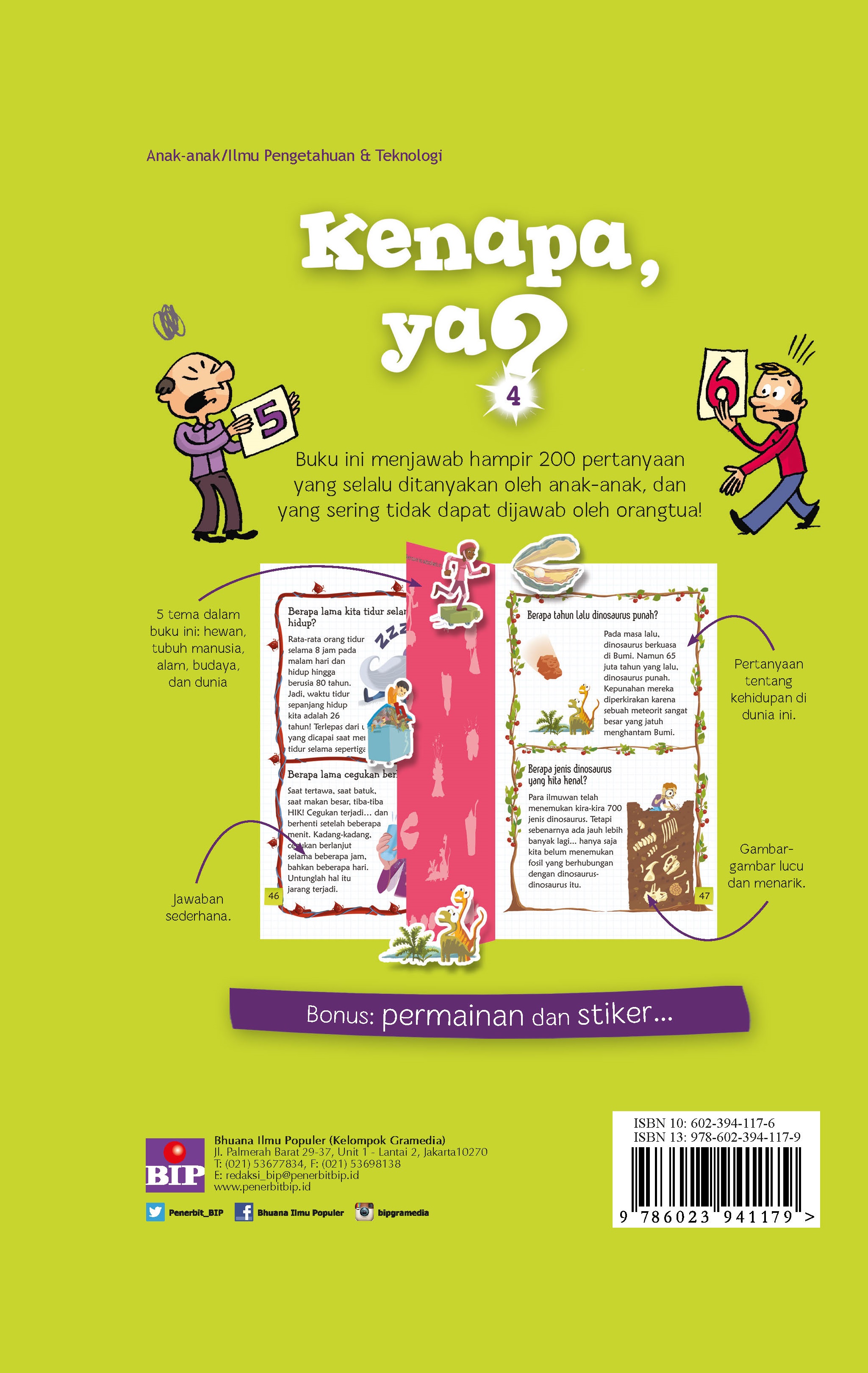 Buku ini menjawab hampir 200 pertanyaan yang selalu ditanyakan oleh anak-anak, dan yang sering tidak dapat dijawab oleh orang tua! Lima tema besar yang dibahas dalam seri ini adalah hewan, tubuh manusia, alam, budaya, dan dunia.